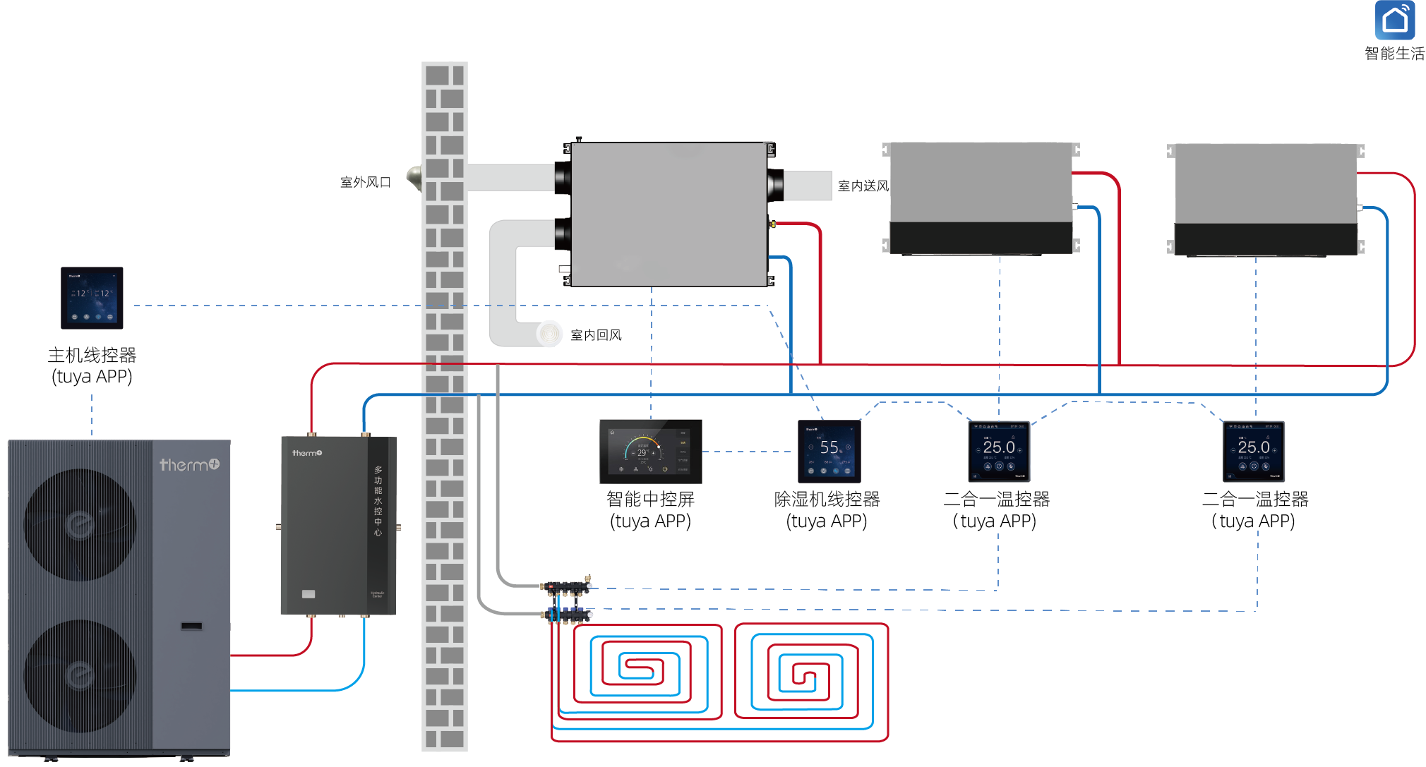 迪莫水环五恒系统由变频主机提供冷(热)水,自适应变频水泵驱动冷(热)水进入无极调速直流风盘和水环再热冷水型新风除湿一体机组成,直流风盘负责控制温度,新风除湿机负责控制湿度和含氧量,用温湿度独立控制的方法来调节室内的温度、湿度、CO₂、PM2.5和TVOC空气质量参数以达到相对最佳健康标准,从而缔造恒温、恒湿、恒氧、恒洁、恒静的室内舒适气候环境。